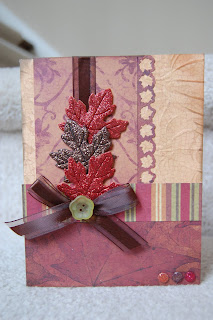 I used Home Decor for the birdie. The black dotted border is a Martha Stewart punch. The sentiment is a stamp but I can't remember who. I embossed the white background with a Cuttlebug embossing folder.